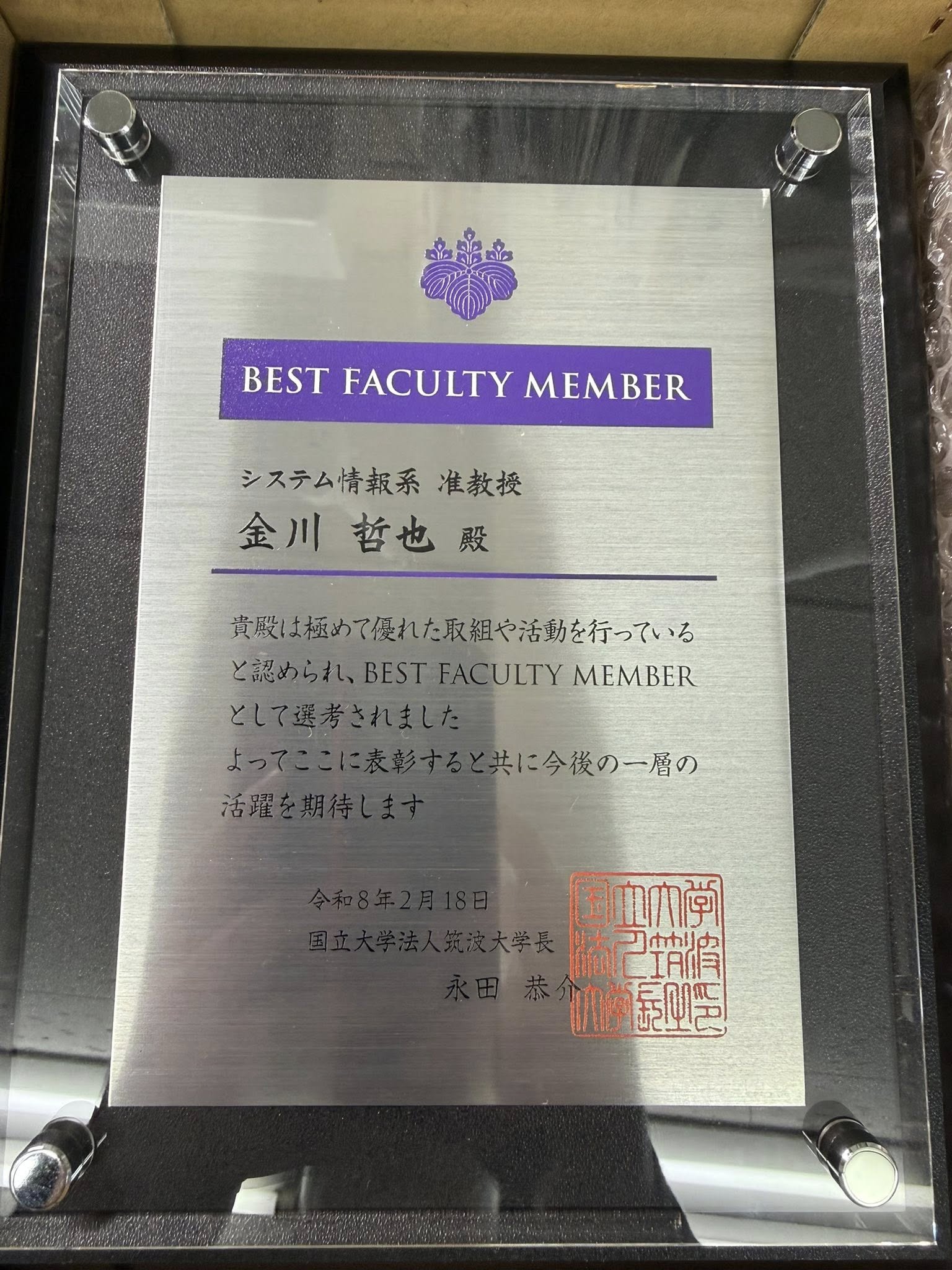 今回、「[教育] [研究] 領域」とは異なる形で、「[教育・研究] 領域」として評価をいただけたことは、教育と研究を切り分け過ぎずに学生と試行錯誤してきた日々を、ひとつのまとまりとして評価いただいたものだと感じています。共同研究者の皆様、研究室学生と講義受講生の皆さん、ならびに推薦・選考に当たられた関係各位に深く感謝申し上げます。今後も、教育と研究の双方を通じて筑波大学への貢献を一層深められるよう努めてまいります(金川哲也)。